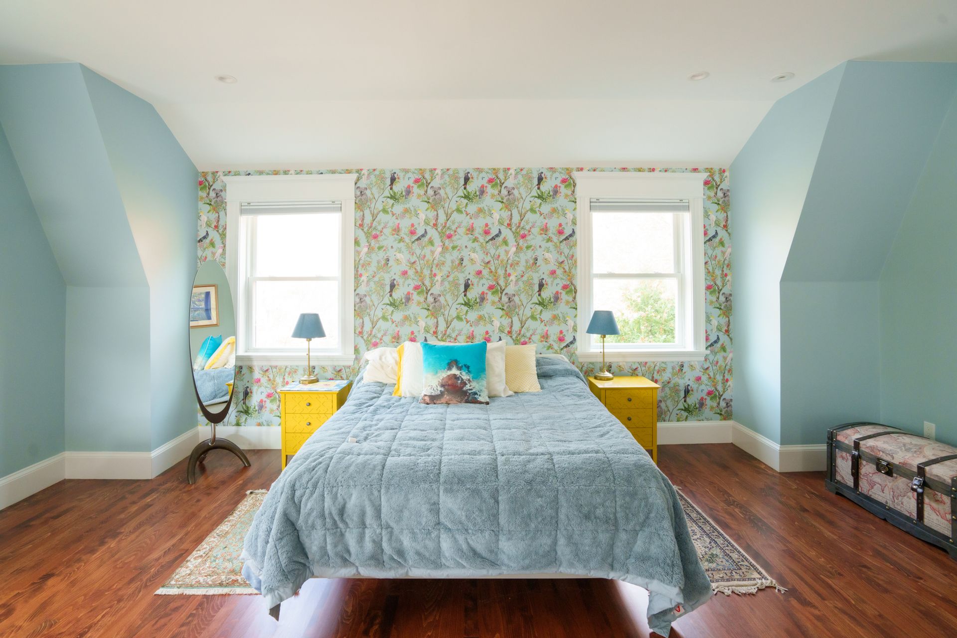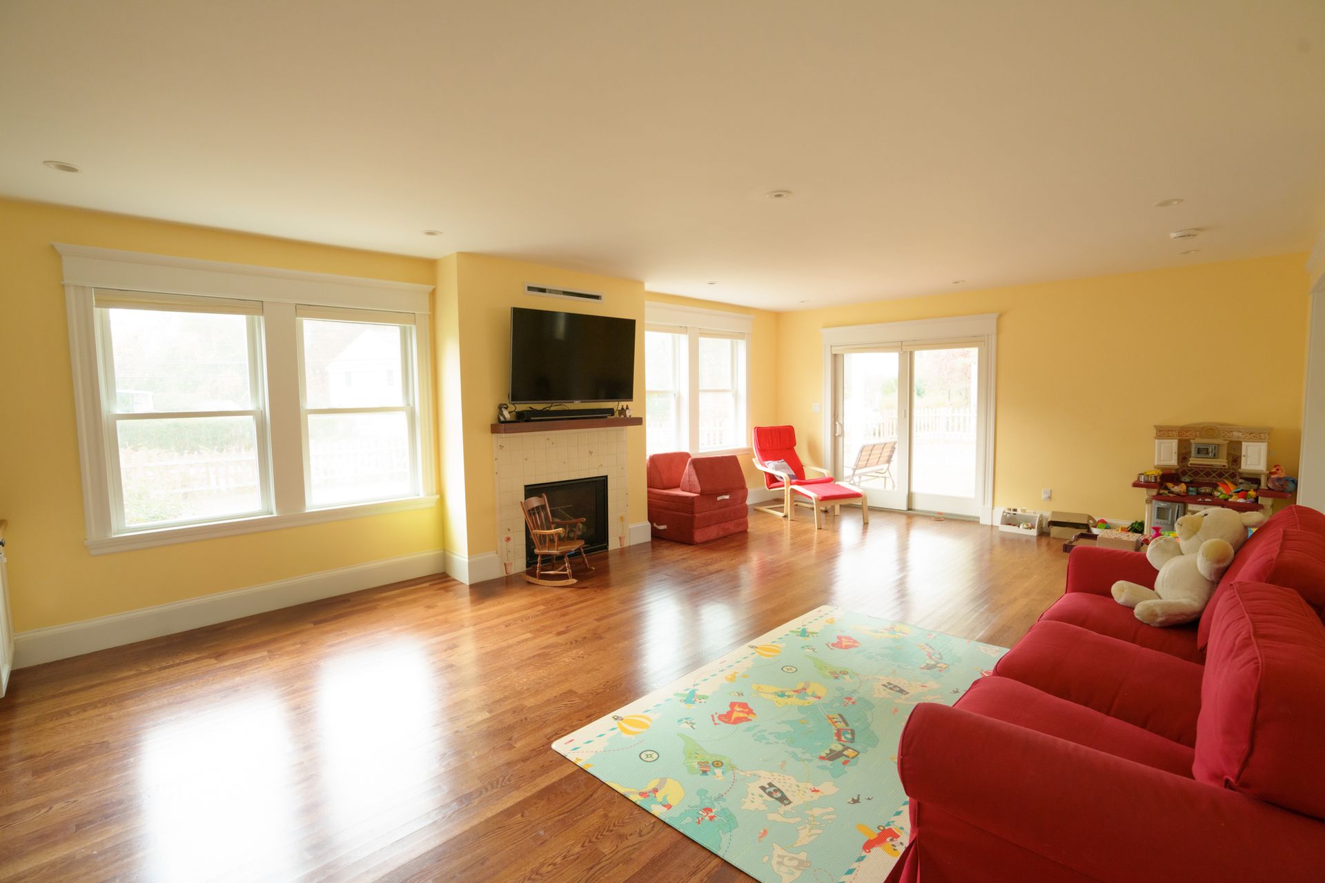 Liberty Homes recently completed this stunning addition which features a living room and playroom on the first floor and a spacious master bedroom and bathroom on the second floor. The living room was equipped with custom wood cabinets and a bespoke fireplace while the master bedroom features walk-in wardrobes and a comfortable office nook! We love the wallpaper our clients chose which transformed the bedroom and master bath into a whimsical wonderland.  Every morning must feel like waking up in a fairytale!