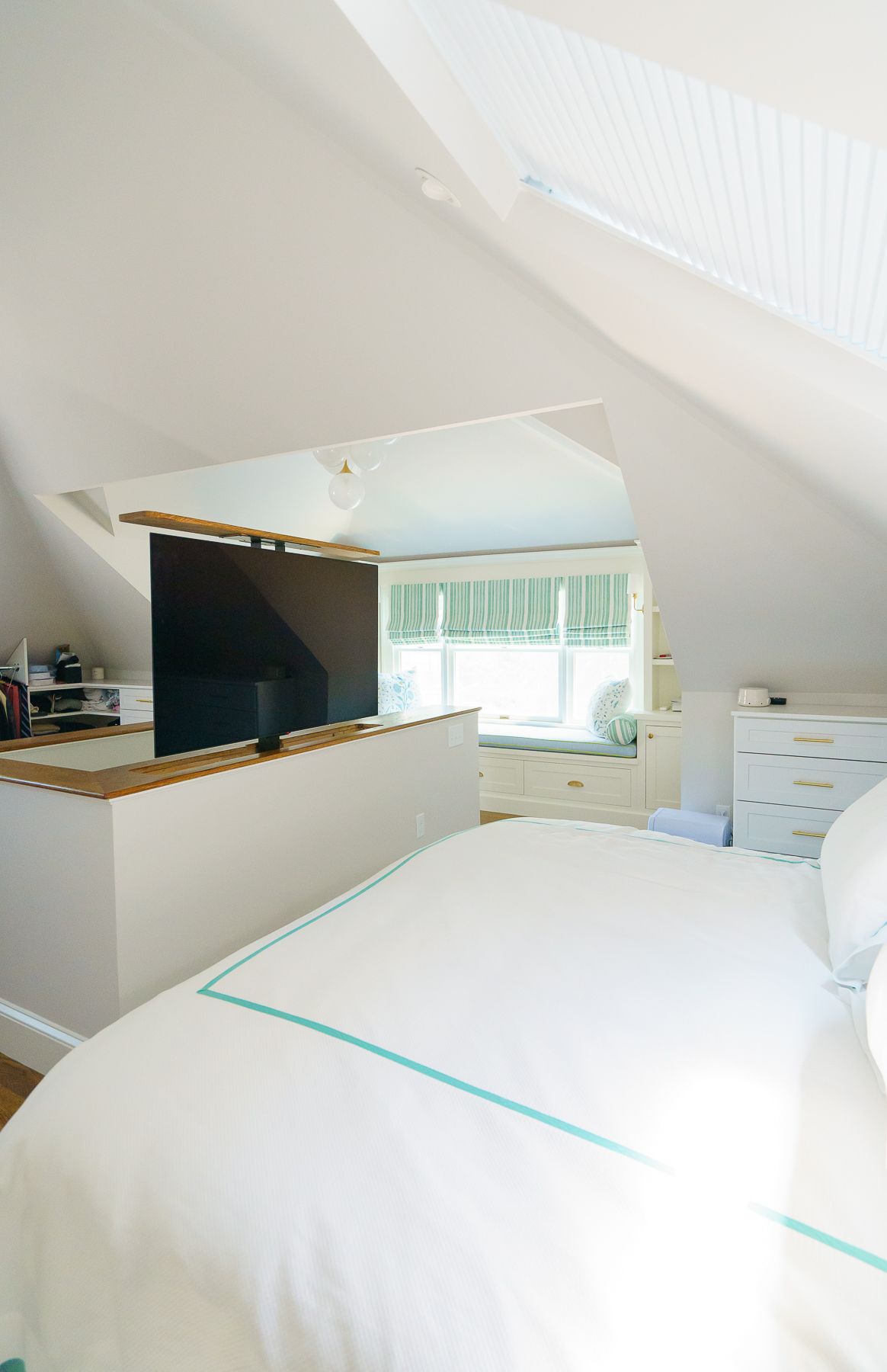 Consider installing a hidden TV that can be concealed inside a wall with a TV lift mechanism or or framing it as a piece of artwork. This way, you can enjoy your favorite shows without sacrificing the aesthetic of your room.