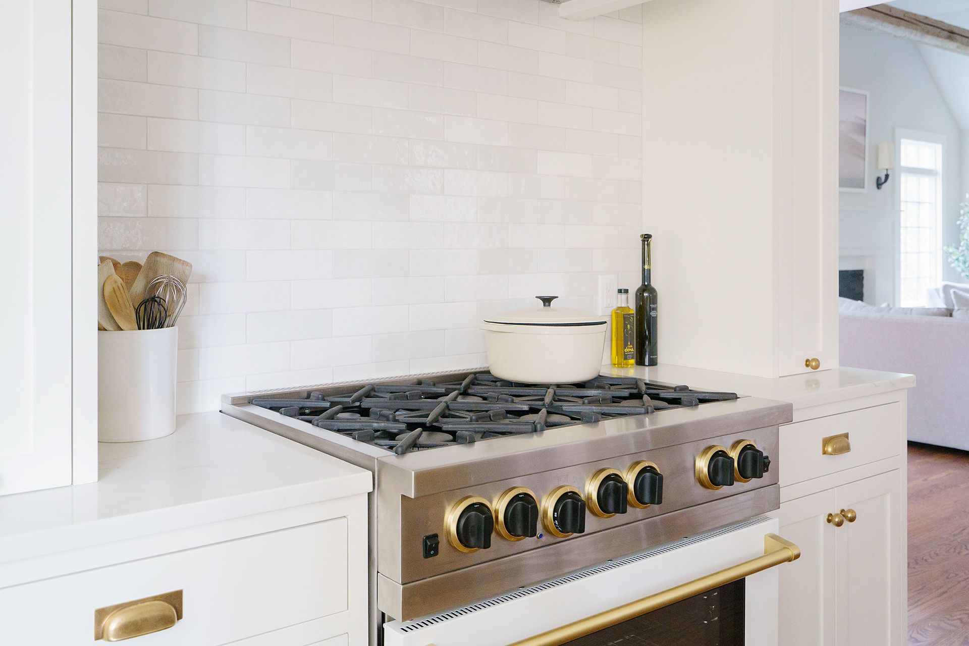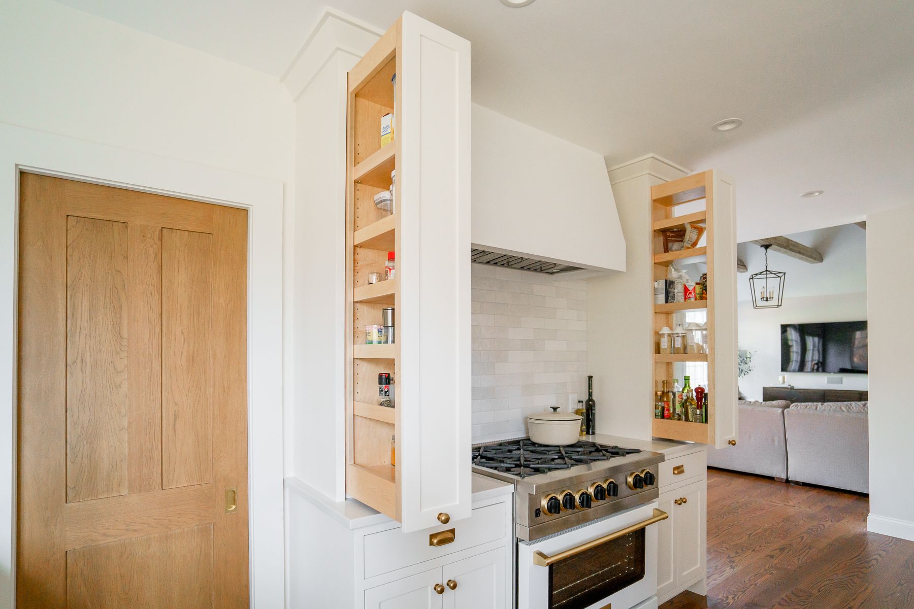 One of the key features of this kitchen renovation is the emphasis on hidden storage. From pull-out spice cabinets on each side of the Blue Star gas stove to ample storage space for appliances, every detail was thought out to create a clean and clutter-free kitchen.