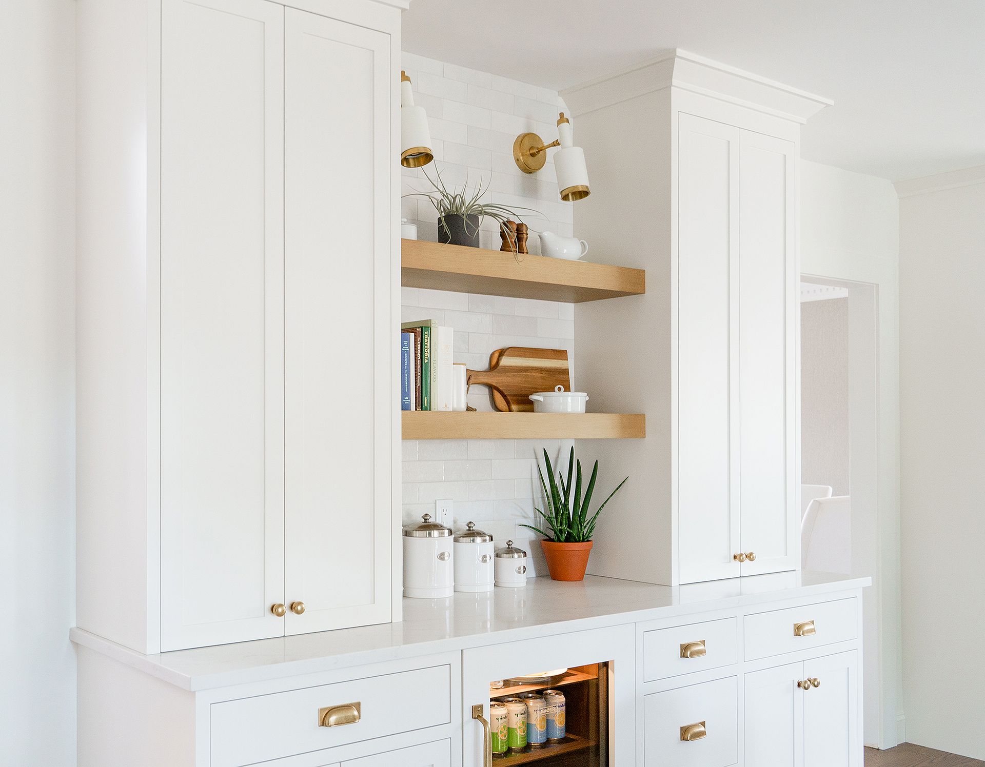 For those who love to entertain, a drinks bar is a must-have. It's the perfect place to mix up a cocktail or pour a glass of wine while chatting with guests. And, for those who love to cook, the open shelving provides an easy way to grab your favorite cookbook or ingredients.