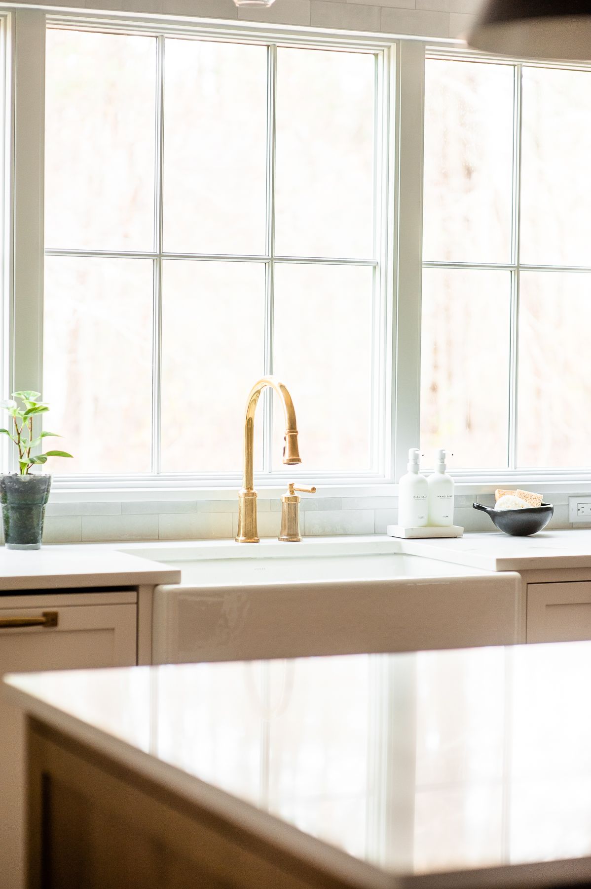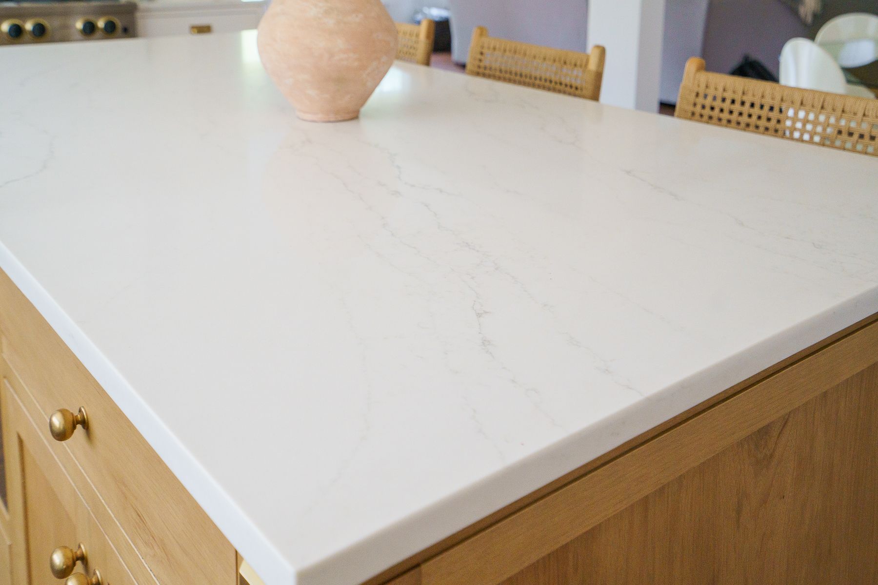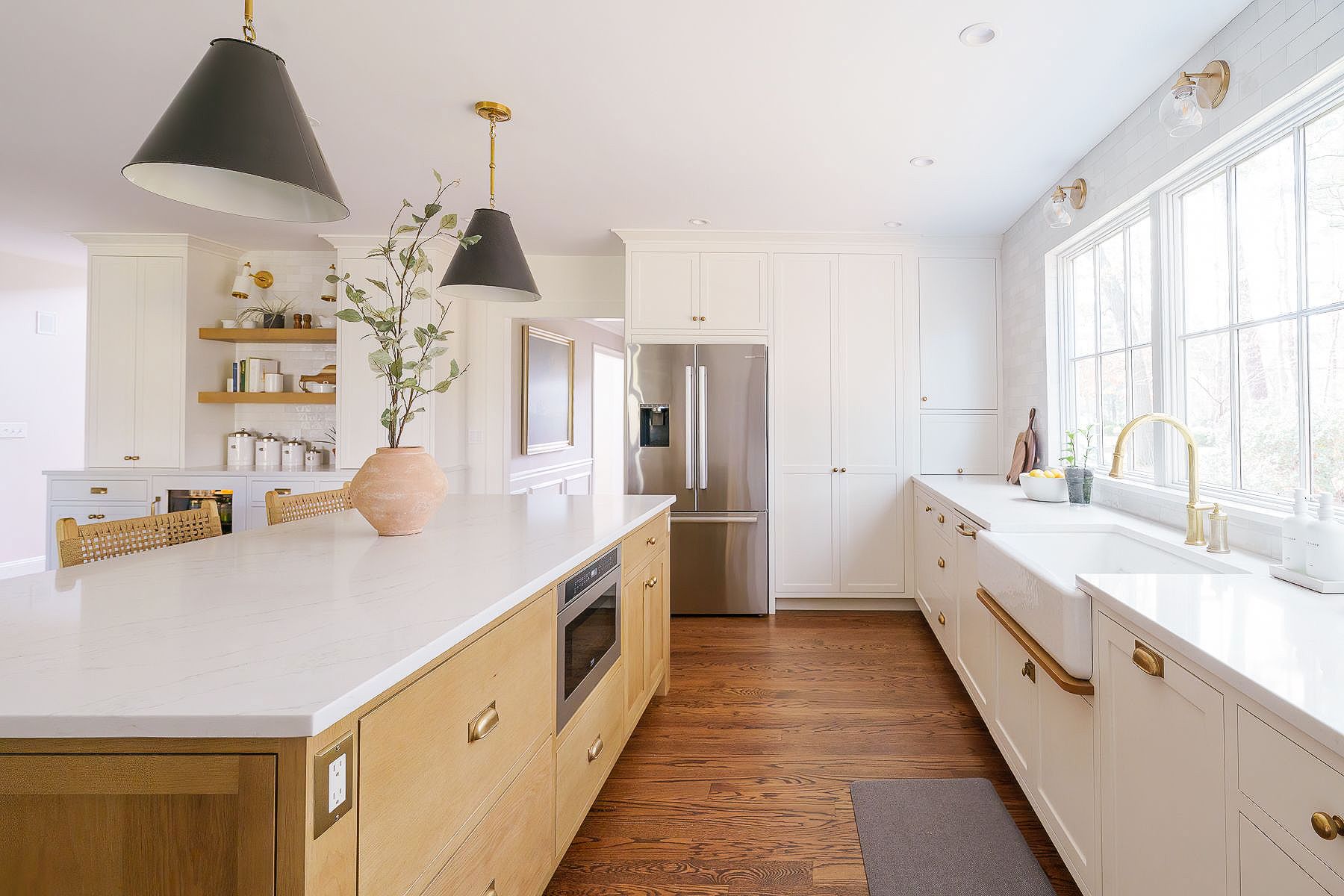 The centerpiece of this kitchen renovation is the beautiful large wooden island with stunning quartz countertops. The island provides ample counter space for cooking, preparing food, and entertaining guests. The off-white cabinets and gold fixtures complement the warmth of the wood, creating a cozy and inviting atmosphere.