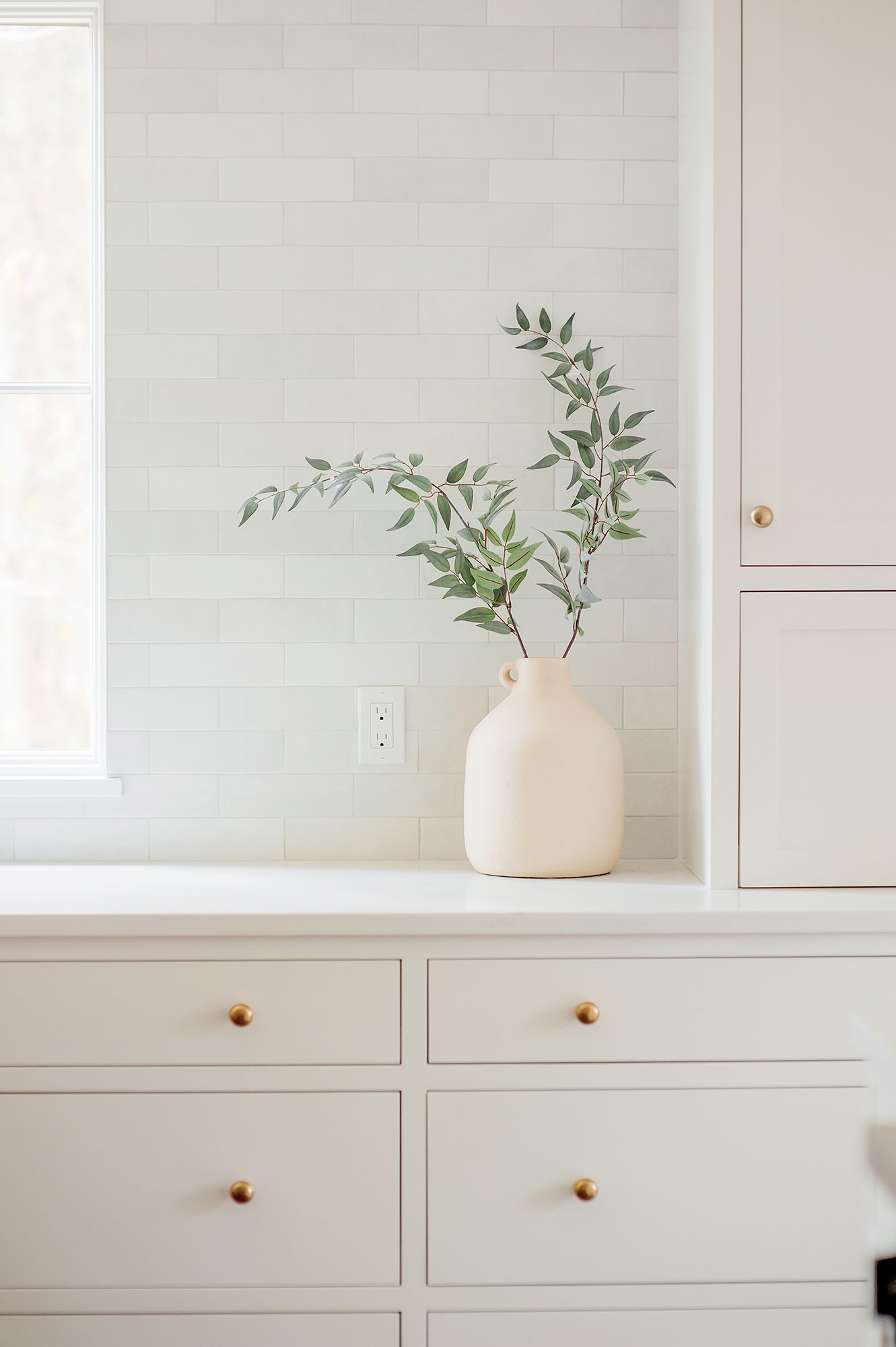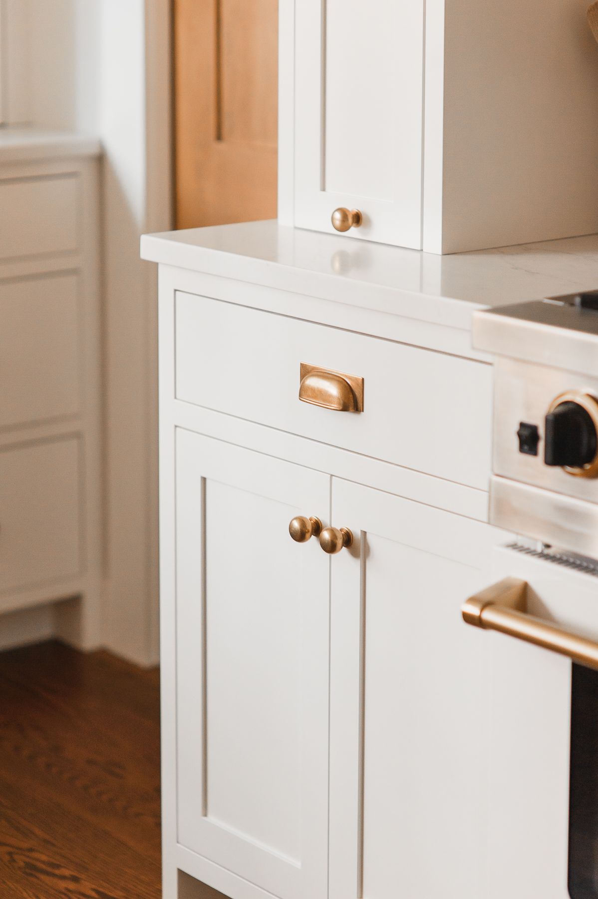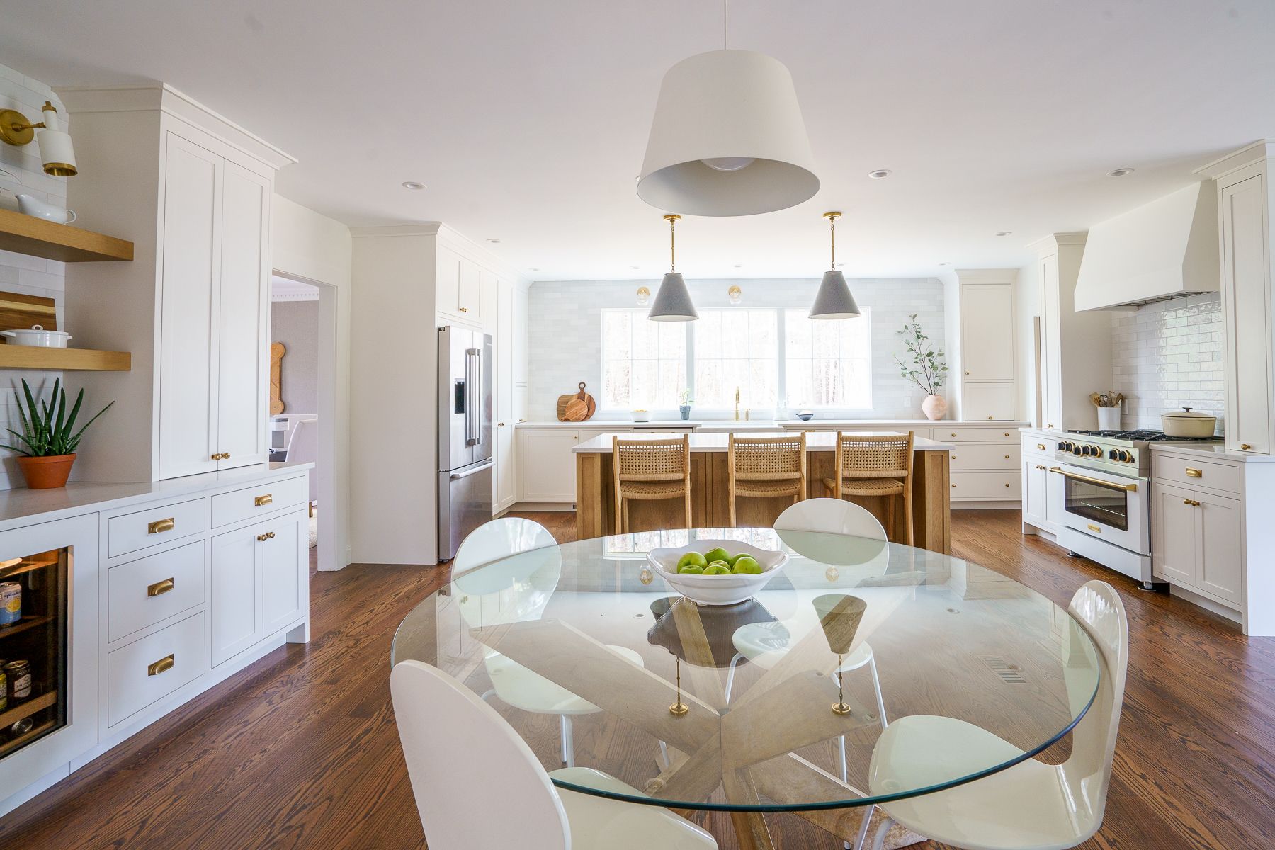 The centerpiece of this kitchen renovation is the beautiful large wooden island with stunning quartz countertops. The island provides ample counter space for cooking, preparing food, and entertaining guests. The off-white cabinets and gold fixtures complement the warmth of the wood, creating a cozy and inviting atmosphere.