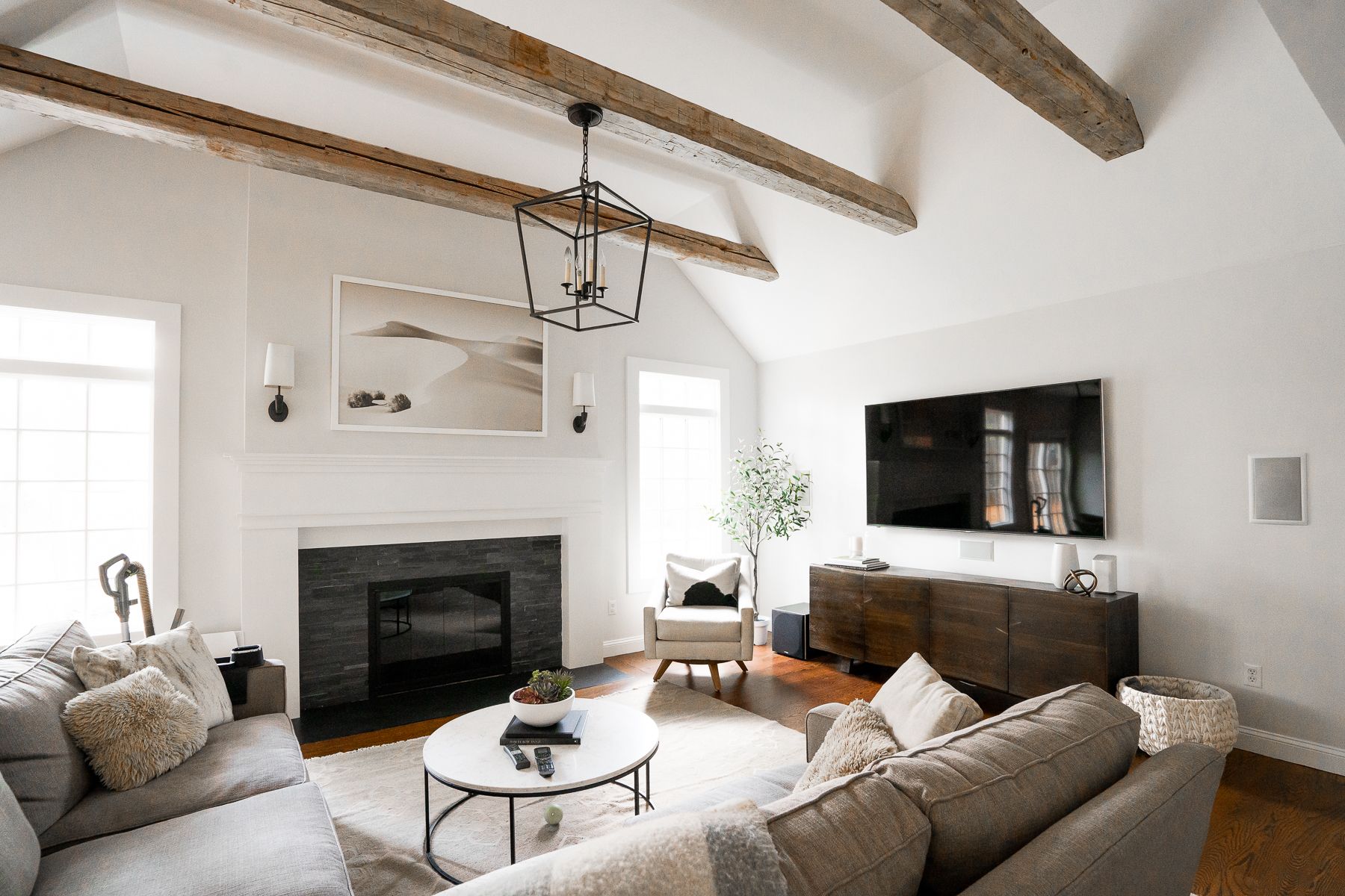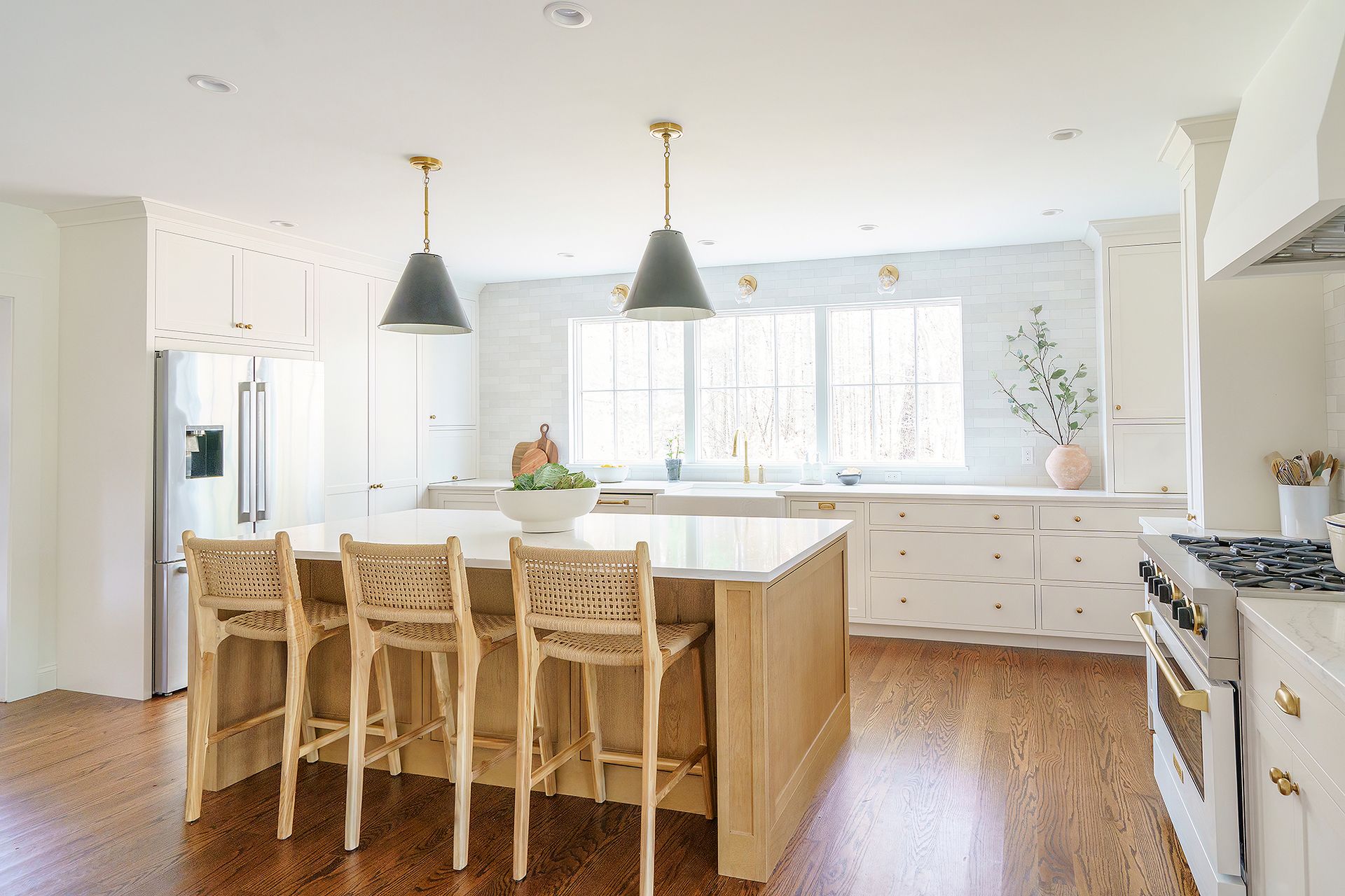 The kitchen was designed to complement the existing living space which had beautiful farmhouse beams, creating a harmonious blend of modern and rustic elements. The huge windows allow natural light to stream in, illuminating the space and highlighting the beauty of the wood and fixtures. The black light pendants over the island add a touch of drama.